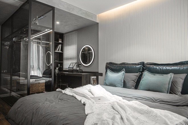 全透明的衣帽間,保留了通透的采光,依然延續(xù)了無主燈設計,在燈光氛圍的烘托下,也不失是一種工業(yè)風的設計語言。