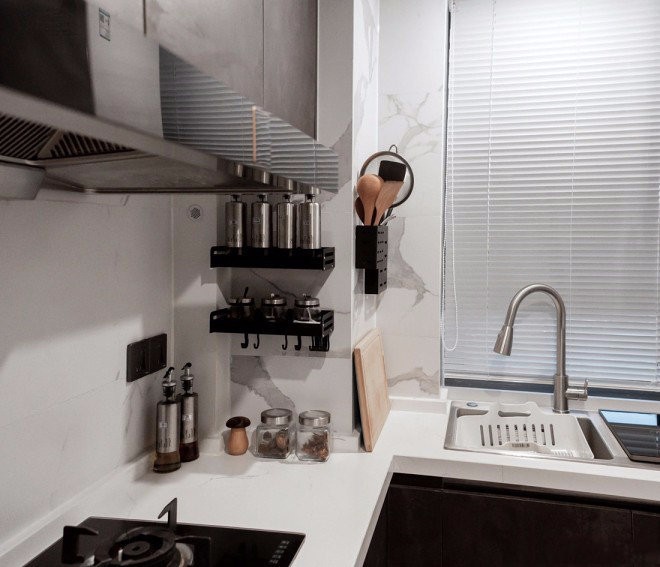 整體爵士白的廚房臺面以及墻磚塑造出干凈明亮的空間視覺感,不論再多的瑣碎物品,也可以好好的規(guī)整起來。
