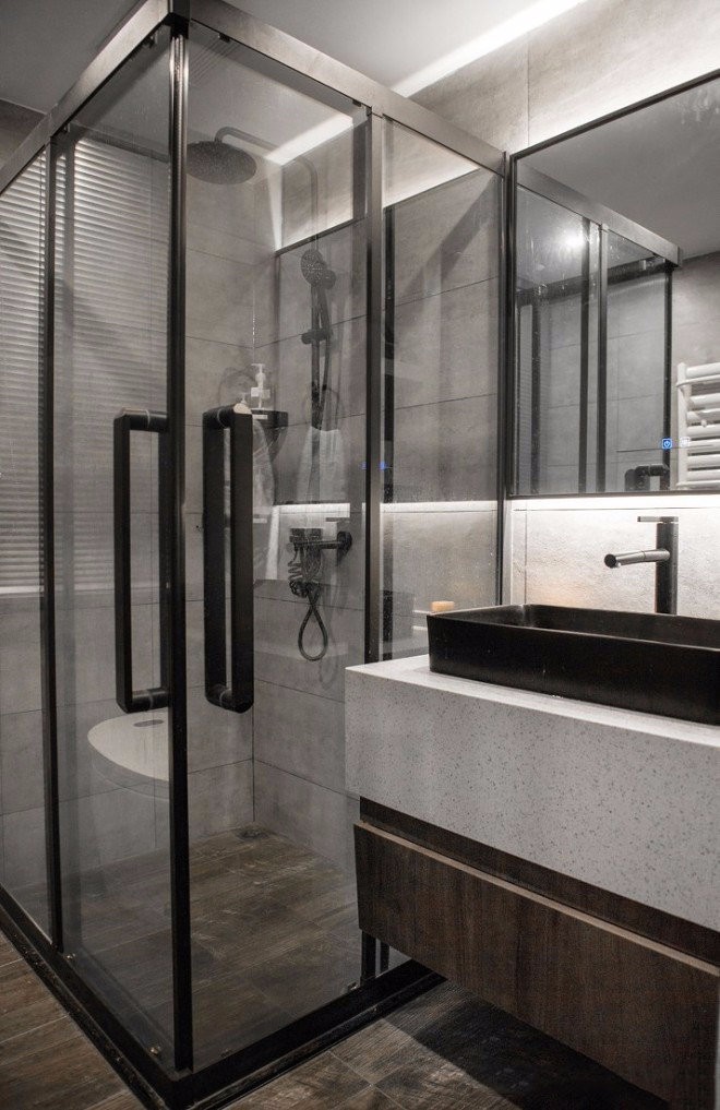 白色水磨石臺面和黑色磨砂臺上盆的碰撞,胡桃木色柜體和木紋磚的碰撞,燈帶的科技感的調(diào)性,材質(zhì)在這個黑白灰的空間里演繹的淋漓盡致。