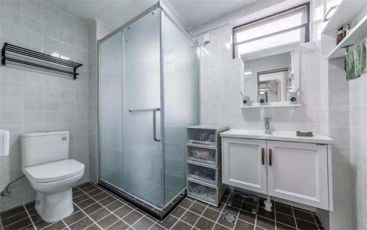衛(wèi)生間的淋浴房是做在了角落處,馬桶和洗手臺(tái)分列兩側(cè),這樣空間會(huì)更為寬敞一些,更適合小衛(wèi)生間。????
