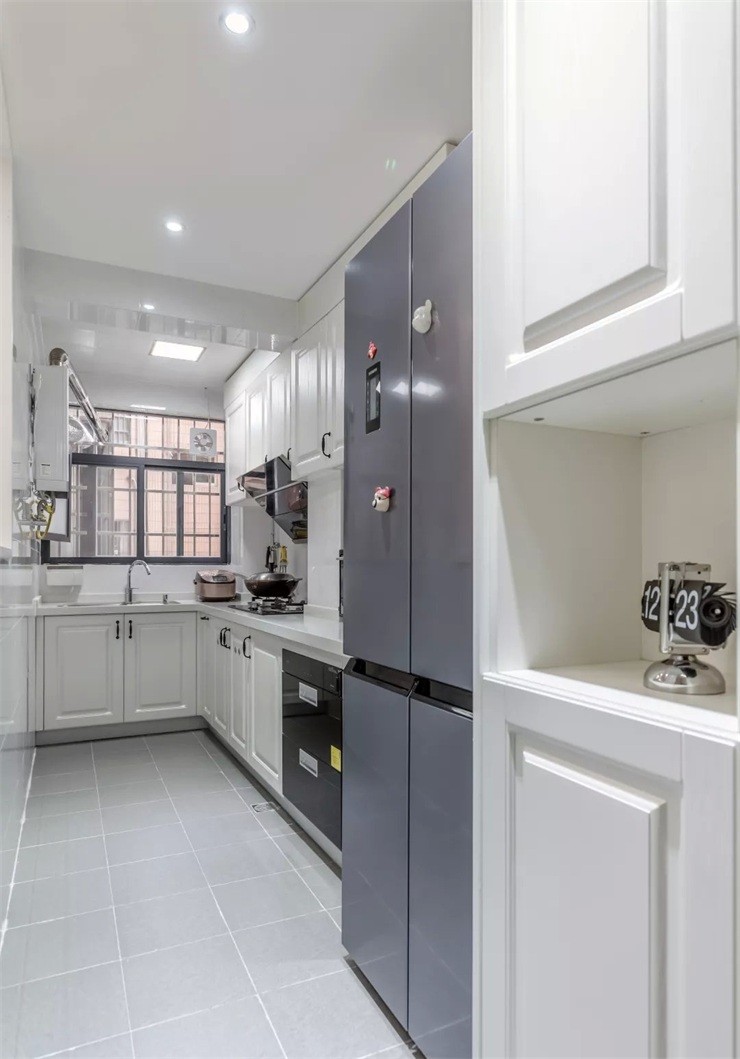 廚房是做了L型的櫥柜,這是非常適合長條形廚房的做法。冰箱做在了兩個(gè)柜子之間,預(yù)留下一個(gè)剛剛好的位置。