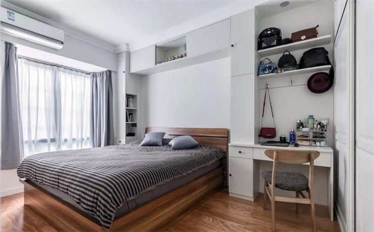 主臥室的床頭背景墻和沙發(fā)背景墻做法類似,用柜子來代替床頭柜,上方還有吊柜,可以擁有超多的儲(chǔ)物空間。