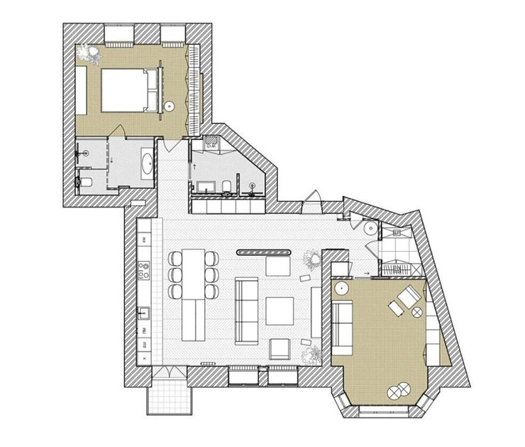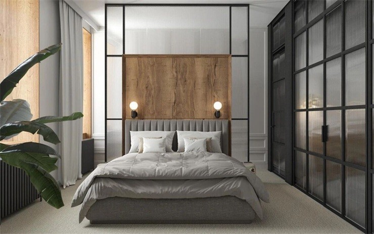 地面鋪設(shè)的地毯與墻面的木料,顯得溫暖而舒適,大顆的綠植增添空間的活力,以日式的酒桶代替床頭柜使用,這里結(jié)合了屋主喜愛的諸多元素。