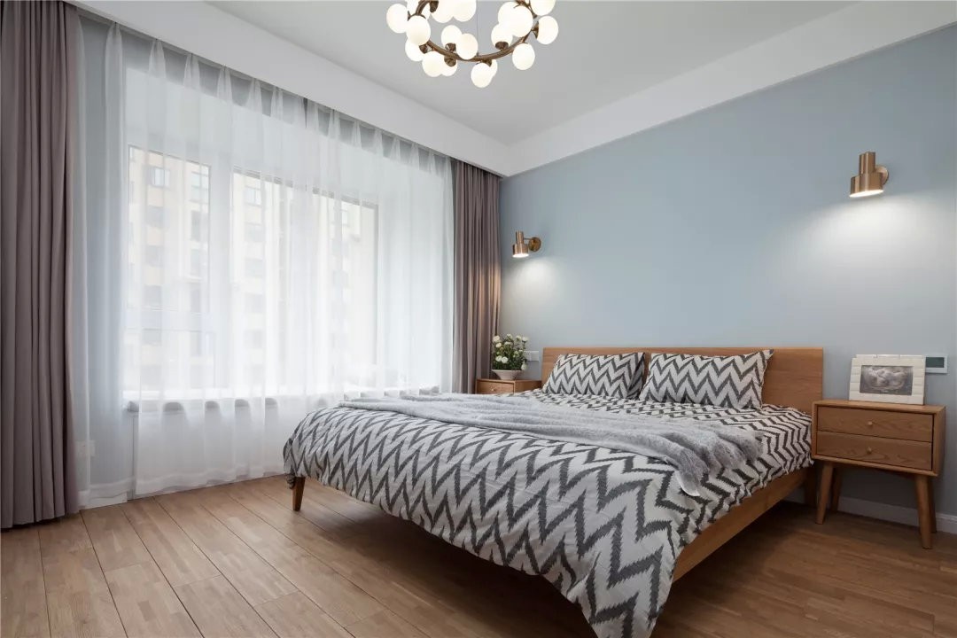 臥室淡藍色的墻面,搭配原木質的床、床頭柜,還有灰白配的波浪紋床單,頂上一組球形吊燈,讓睡眠空間輕松而舒適愜意。