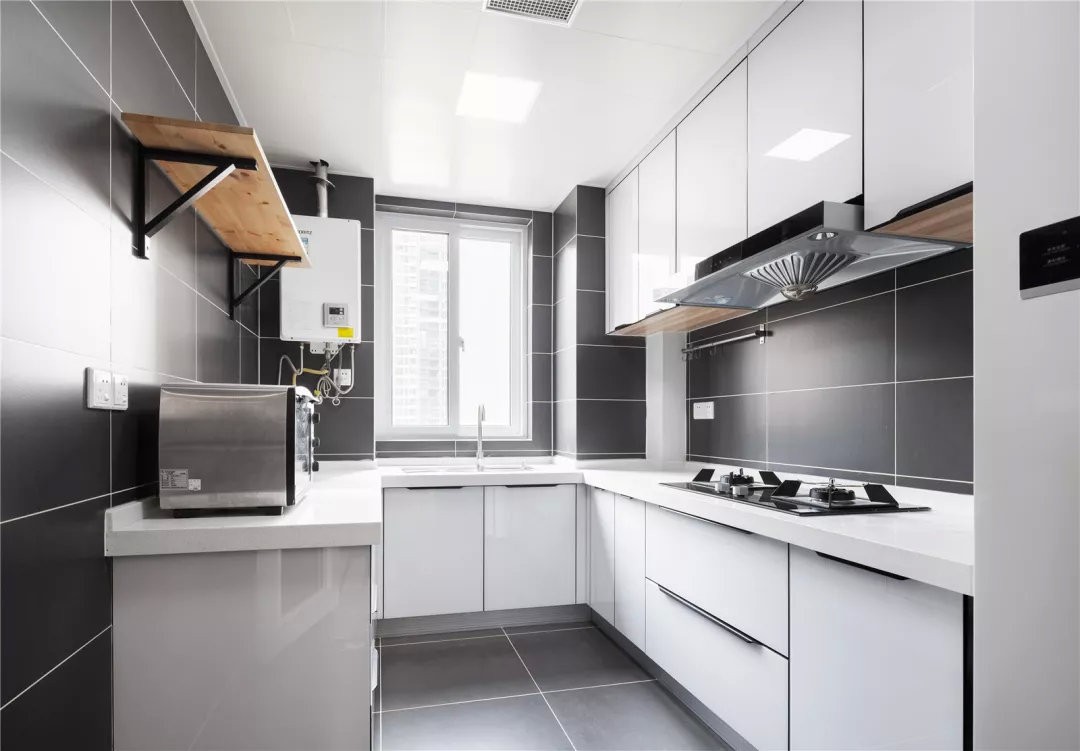 灰色地面墻面的廚房,搭配白色定制櫥柜,U形的操作臺讓烹飪空間顯得格外的現(xiàn)代雅致。