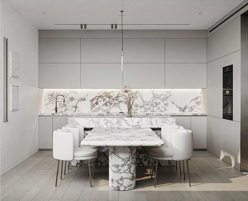 廚房選用大理石和流線型燈進(jìn)行搭配,在色系搭配上延續(xù)簡約風(fēng)格,大理石的紋路加上鏤空設(shè)計(jì)讓空間層次凸顯大氣簡約風(fēng)格。