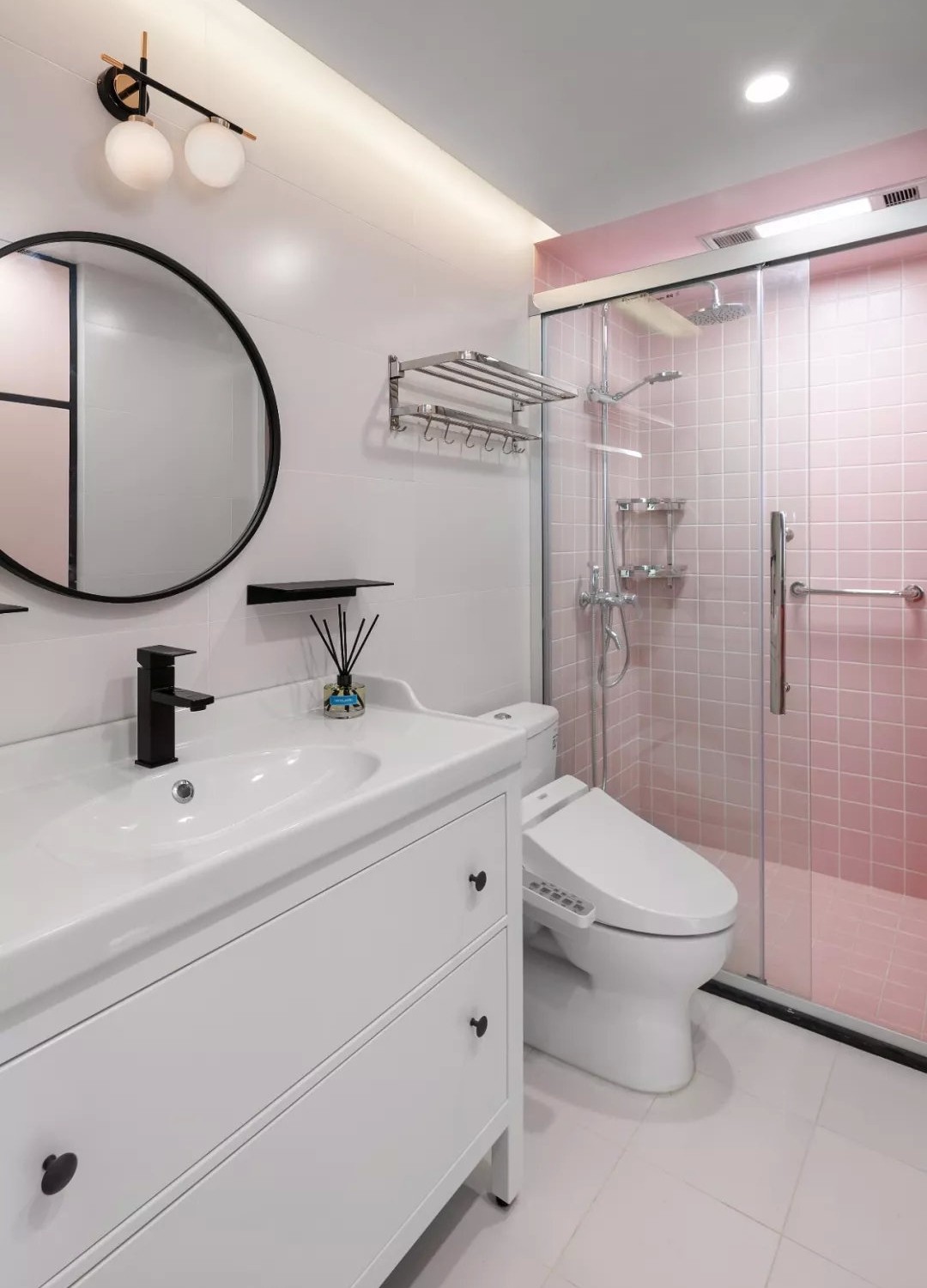 衛(wèi)生間則做了干濕分區(qū),不同色彩的瓷磚視覺(jué)上也分割了兩個(gè)區(qū)域。