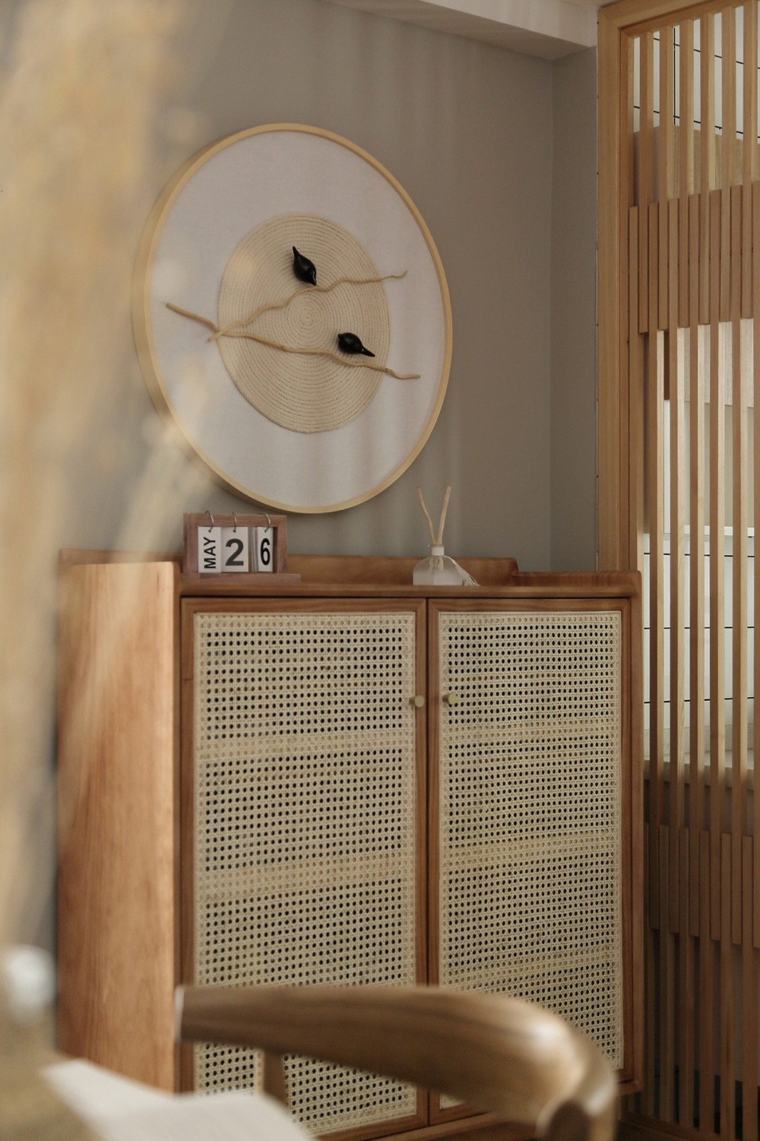 進門即嗅到大自然的原木色玄關(guān),原木與暖白掛畫的交錯組合,保證了日常物品的收納,頂面筒燈的光源帶來更加豐富的光影效果。擺放一點飾品,增加功能之外的審美,與印象里暗黑擁擠的玄關(guān)相比,這里才是家的味道。