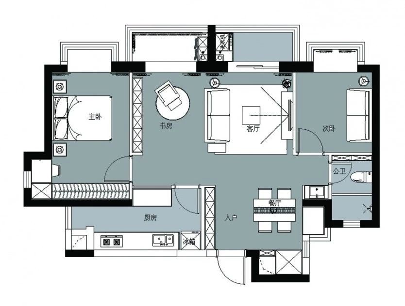 兩個小陽臺為客廳與開放式書房帶來充沛的光線,營造敞亮明凈的空間氛圍。三人位沙發(fā)足以滿足屋主生活所需