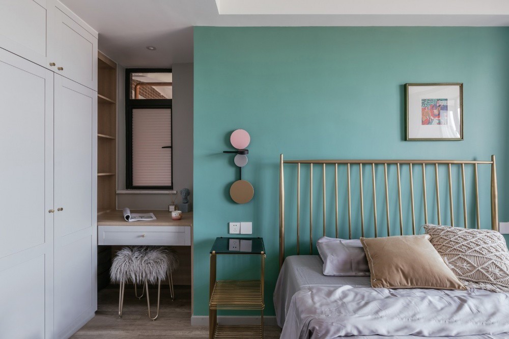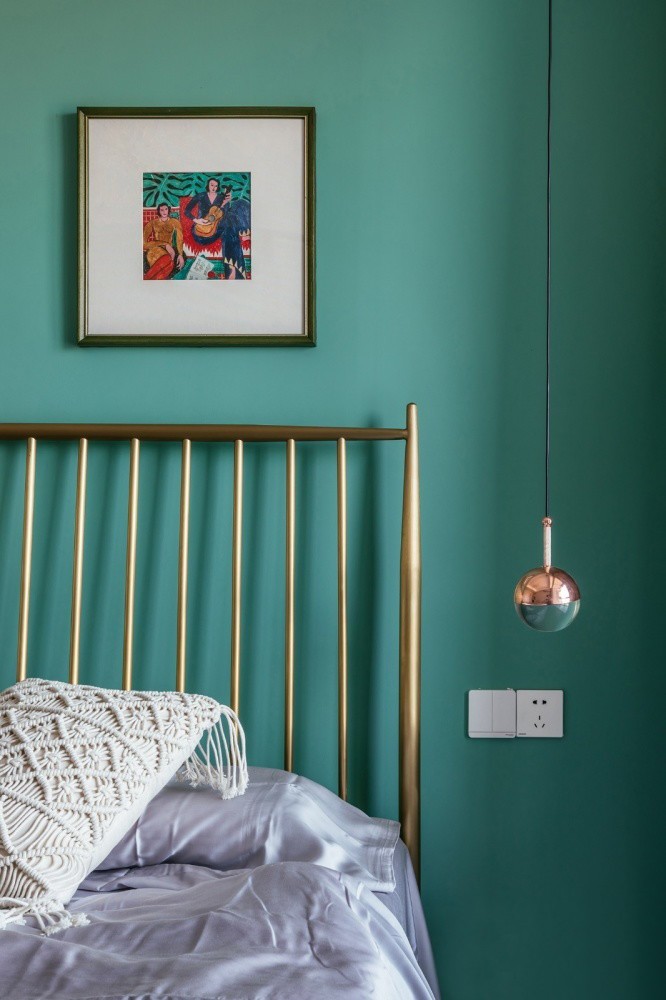 主臥選用清新的綠色調(diào),搭配黃銅雙人床、燈具以及小邊幾,精致而復古,***感十足。
