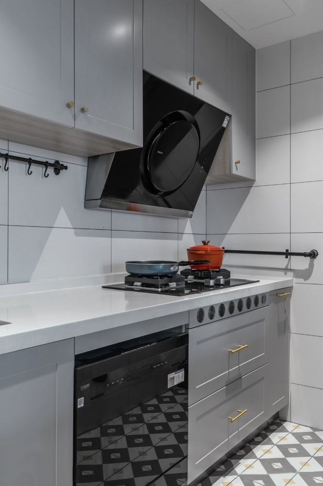 廚房墻面鋪設(shè)白色瓷磚,灰色櫥柜金色拉手,配上地面的小花磚,既精致耐看又方便打理。