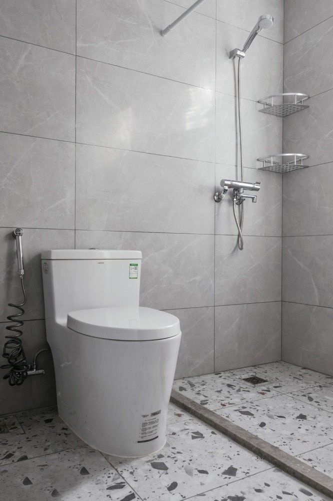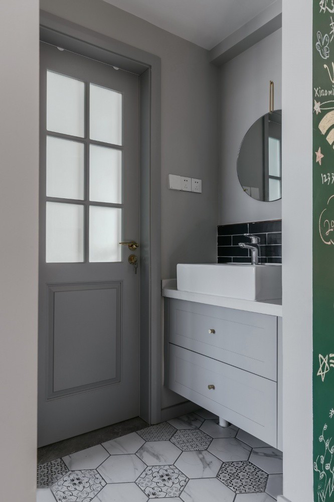 衛(wèi)生間干區(qū)以灰色為主調(diào),墻面局部鋪貼黑色瓷磚,防水的同時也讓視覺層次更加豐富,