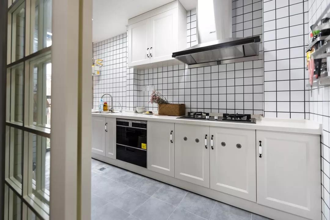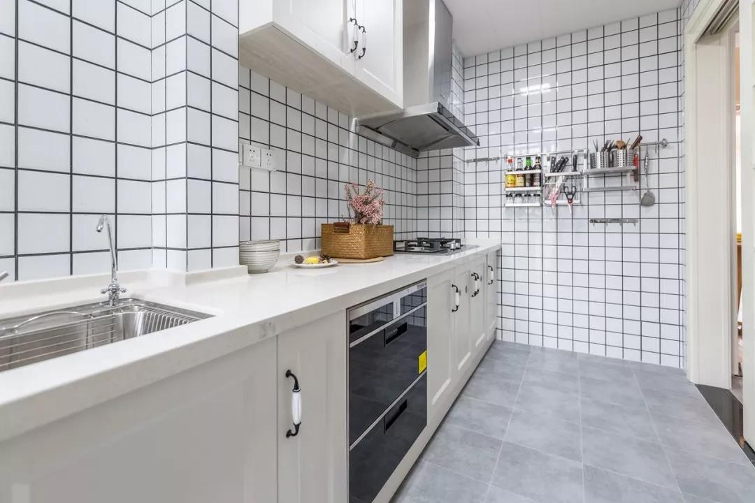 廚房以淺灰地磚+白色小磚墻面,一字型的操作臺(tái),雅白的櫥柜