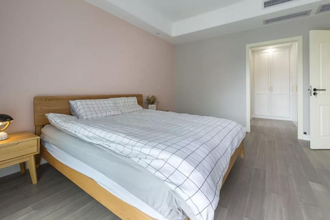 主臥床頭墻是淡粉色的,側(cè)邊墻面則是淺灰色,搭配木質(zhì)床與簡(jiǎn)約的床單