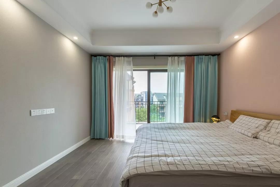 窗簾加入了藍(lán)色、粉色與紗簾,撞色的軟裝,為空間帶來更加優(yōu)雅端莊的氣質(zhì)感