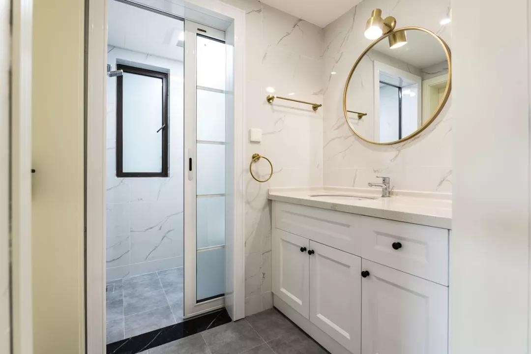 衛(wèi)生間以白色大理石質(zhì)感墻面,搭配簡(jiǎn)約灰色調(diào)的地面,整體白色的洗手盆柜
