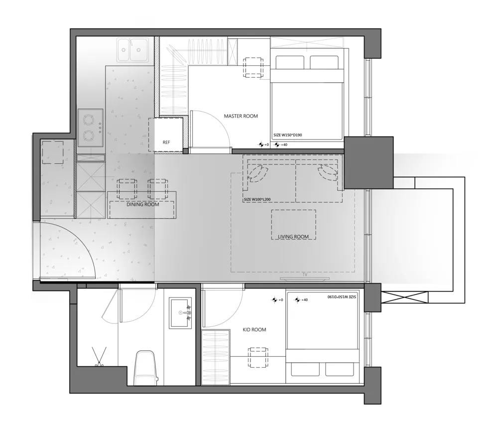 入戶設計一個鞋柜整合儲藏室,將原來放外面的廚具位移到內(nèi)側,讓廚具、電器柜、鞋柜、餐桌整合再一起,房間維持在兩側,中間盡量讓客廳大一些。