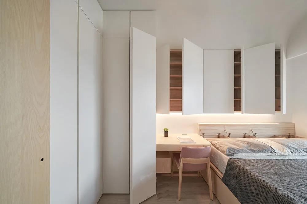 主臥室因為空間不大,所以將衣柜設計成L型并且與化妝桌整合,床頭上方也做了不少收納柜。