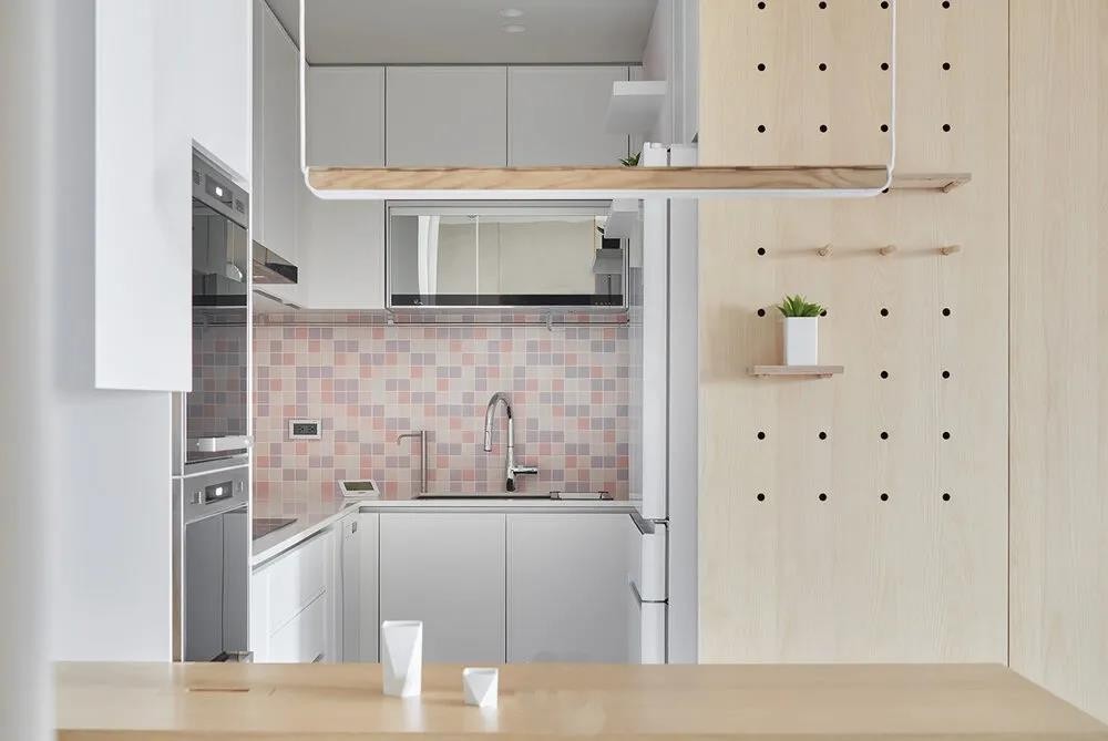 因為空間小,所以盡量將柜子整合再一起,儲藏室+鞋柜+餐桌+電器柜+廚具柜,麻雀雖小五臟俱全