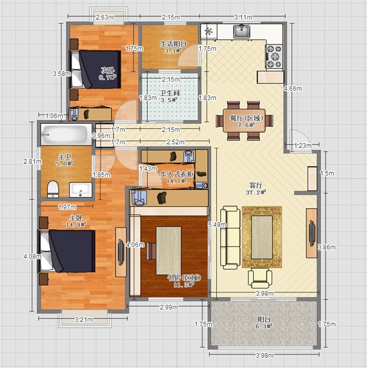 暖木色地板很提氣質(zhì),搭配淺灰色電視墻也不覺得單調(diào)。相比之下,沙發(fā)墻設(shè)計(jì)則更有看點(diǎn)。