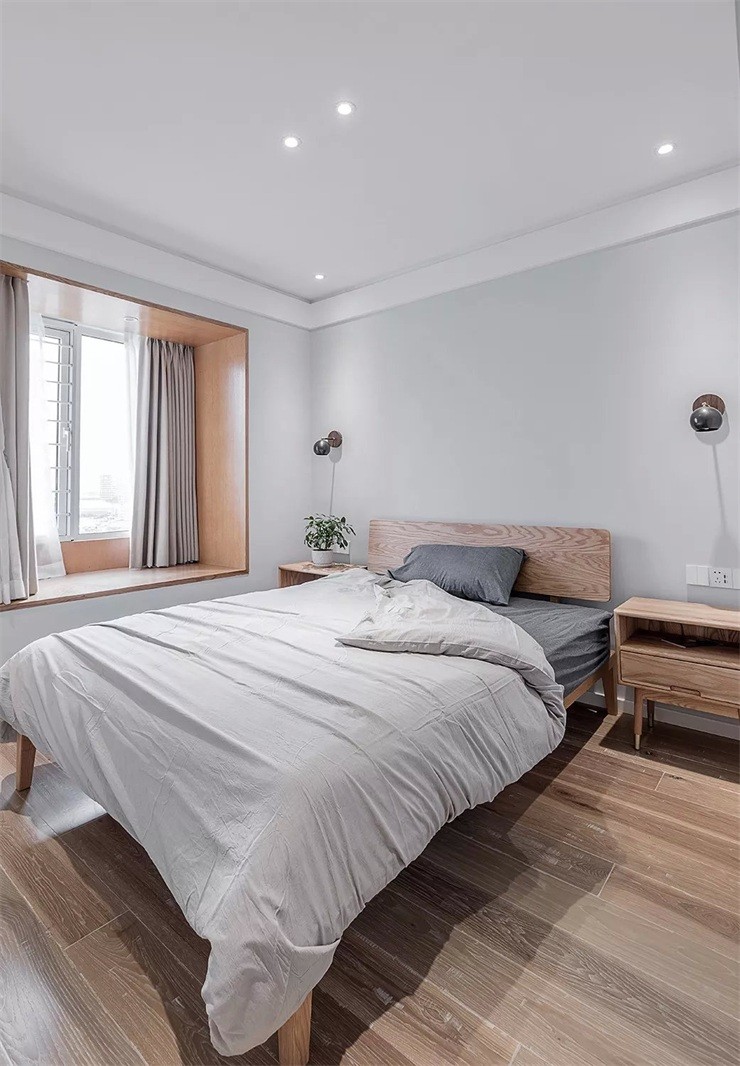 主臥簡(jiǎn)約小巧,整體以淺灰色和木色地板為基調(diào)。