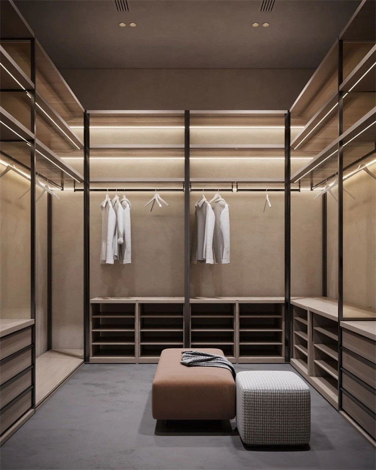 全定制衣柜系統(tǒng)為每件衣服和每雙鞋創(chuàng)造了存放和試用的空間。