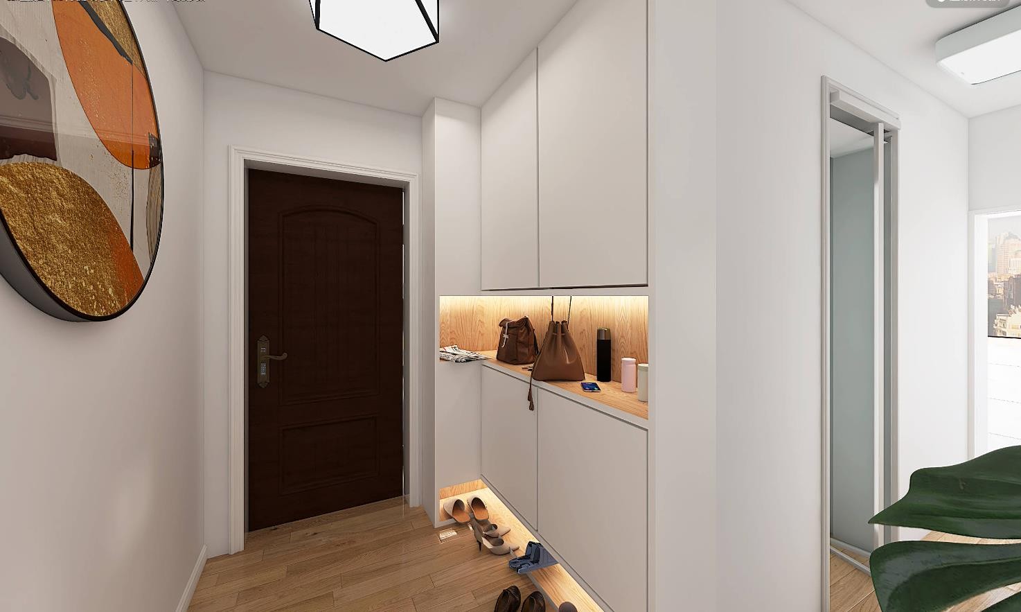 入戶玄關做了整體鞋柜 柜體顏色使用白色 削弱擁擠感 增大入戶空間