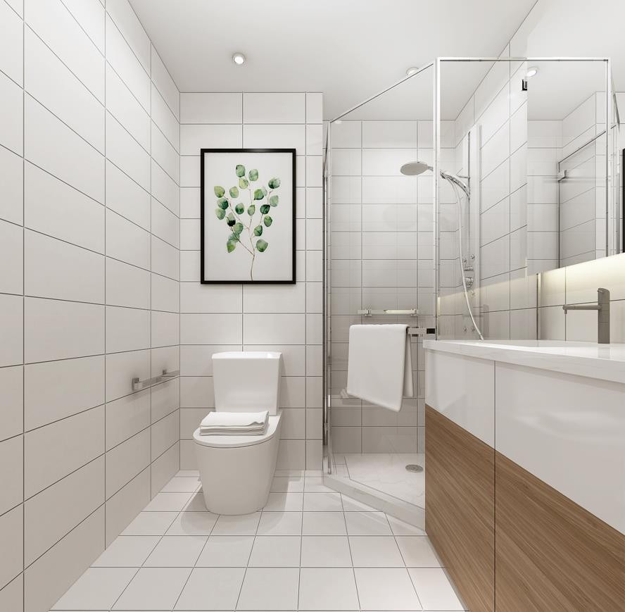 衛(wèi)生間使用白色墻地磚 并作弧形浴房起到干濕分離的作用
