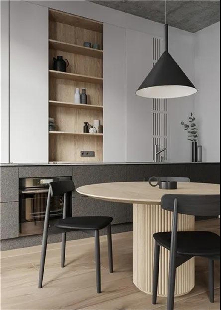 圓形餐桌搭配時髦的黑色休閑椅,打造出簡約美學(xué),時尚又前衛(wèi)。