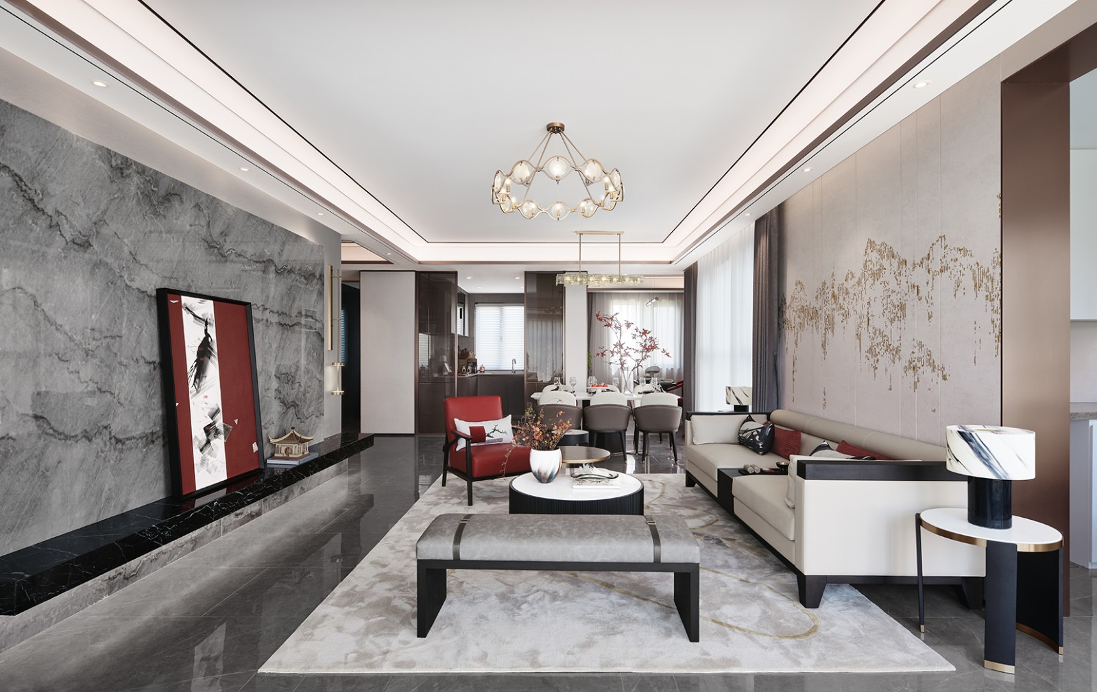 這是他家的客廳,電視背景墻用大理石石材上墻,凸顯出高端品質