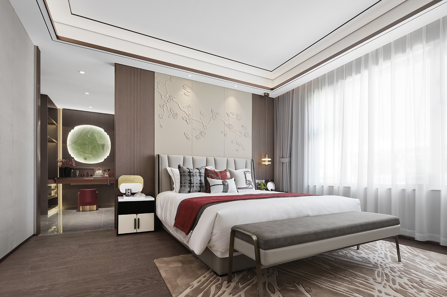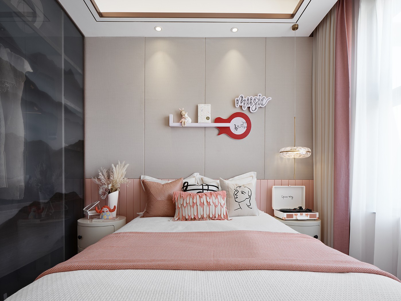 主臥室主人公對生活品質很高,床頭背景墻用高端的木飾面板搭配