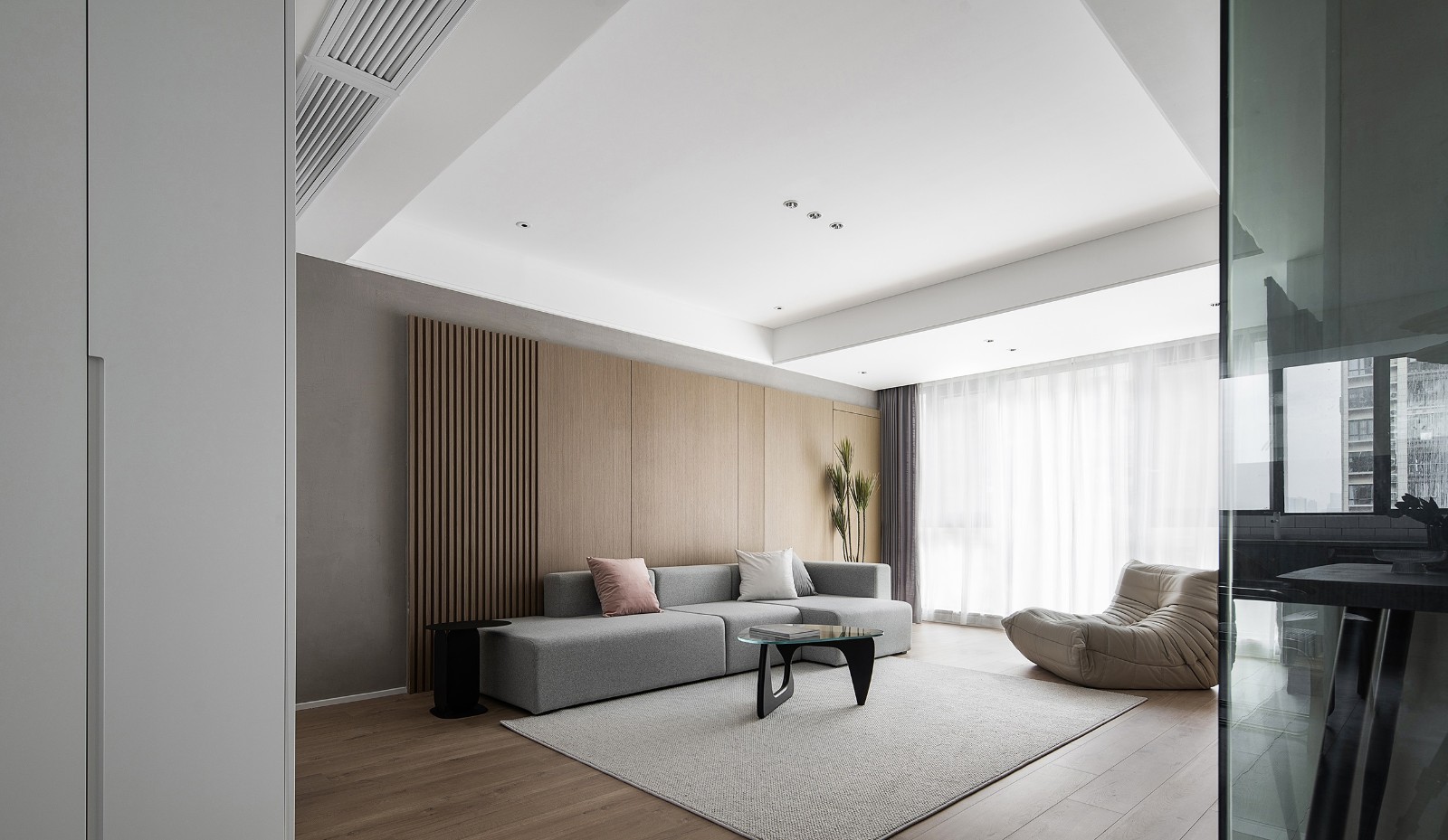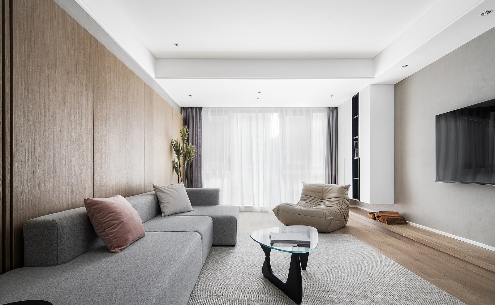 靠陽臺的地方設計了一組白色的柜子,電視柜和多功能房地臺做成了一個整體,形成穿插的效果,沙發(fā)背景因為有一個消防門,我們利用的沙發(fā)背景墻做了一個造型把消防門給隱藏起來了