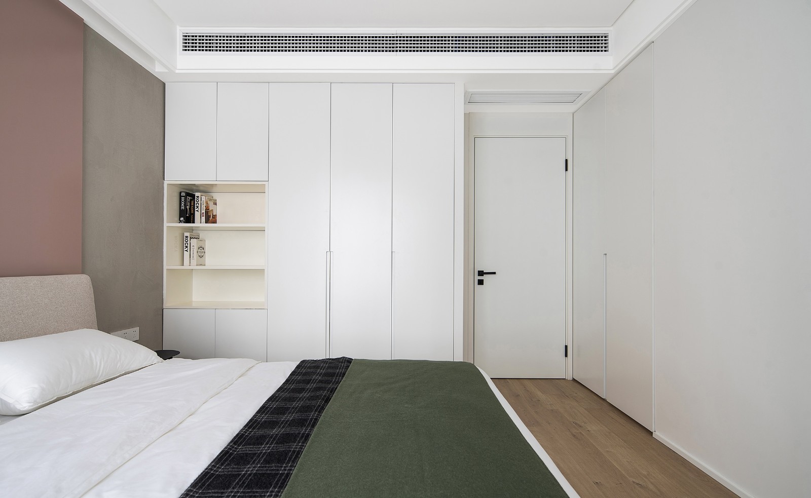 主臥室的設計有幾個細節(jié)可以分享給大家,第-是房門實際是沒有到頂?shù)奈覀兪前验T套做到了頂這樣顯得房門會更加高,第二地腳線我們一個顏色會和門套統(tǒng)一,然后盡量矮-一點,我的這個是3CM的高度,高了會顯得很笨重,第三衣柜左邊的薄柜子設計不能做一個門到頂?shù)?,很容易會打不開,因為旁邊有床頭柜會擋到,我們是分了上下兩節(jié),中間放一些常看的書,下面放一些不常用的,避免了柜門打不開的尷尬