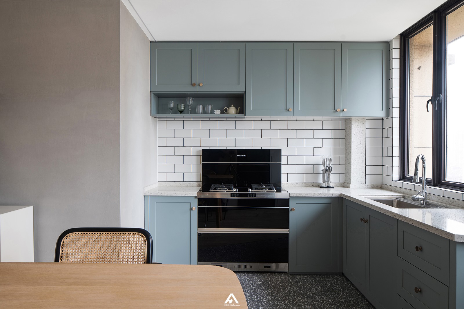 廚房的柜門顏色和款式做了一個撞色的設計,集成灶離排煙口非常近,做了敞開的廚房來增大餐廳的空間
