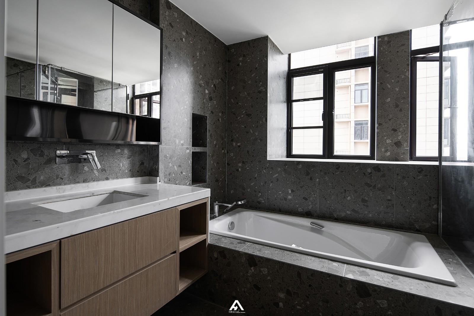 墻面用的是防水磨石的磚,鏡柜的設計考慮收納和 非收納的位置,下面一 截平時可以放一些常用的,鏡子柜1門收納一些不常用的