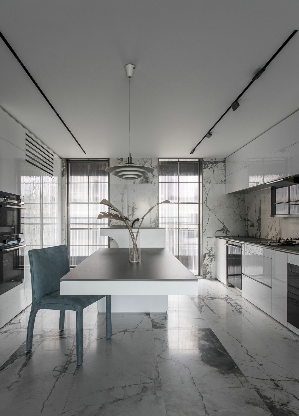 原本封閉廚房打開后,解放餐廚區(qū)域,整個空間的采光豁然開朗,廚房、餐廳、操作臺彼此串聯(lián),形成自由的整體格局。
