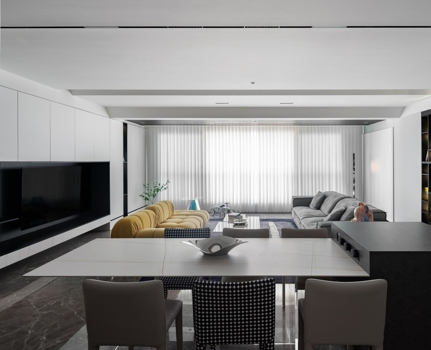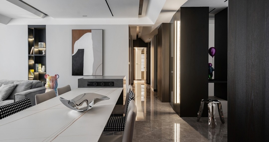 餐廳處用了黑色的飾面板做背景,與客廳的白色形成區(qū)分,巧妙的用顏色將兩個功能區(qū)完美劃分,空間感油然而生。