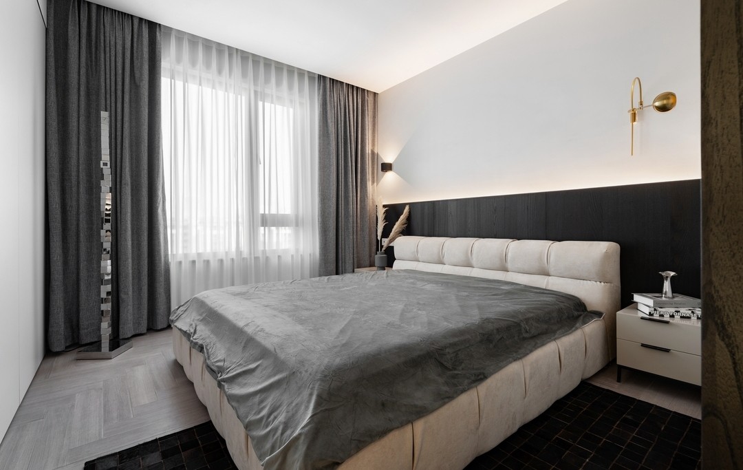 主臥也是黑與白的世界,與客廳等空間設計聯(lián)動,讓整體色調(diào)有了一定的統(tǒng)一。 黑色的飾面板做背景墻,無需多余的裝飾,過于簡潔的線條與弧度柔和的床體,彼此矛盾卻又互相包容。