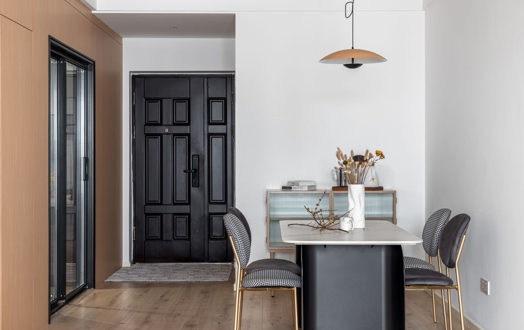餐廳延續(xù)了客廳的風(fēng)格,以原木色和白色為主,其他顏色適當(dāng)點(diǎn)綴。餐廳墻壁沒有任何裝飾,留下大量空白,視覺上餐廳空間更大,整體也更美觀、大氣、簡雅、端莊。