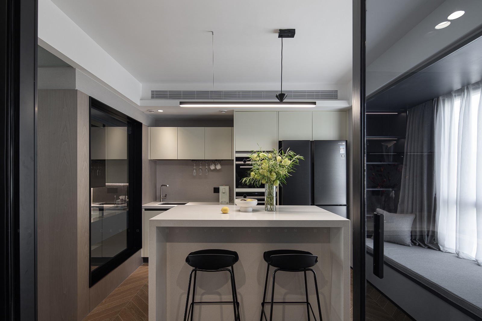 以一扇黑色玻璃門為界,廚房與餐廳形成一種自由的烹飪與用餐的互動。 相比于西廚的白,中廚采用了細膩的灰色,簡潔大方又時尚。