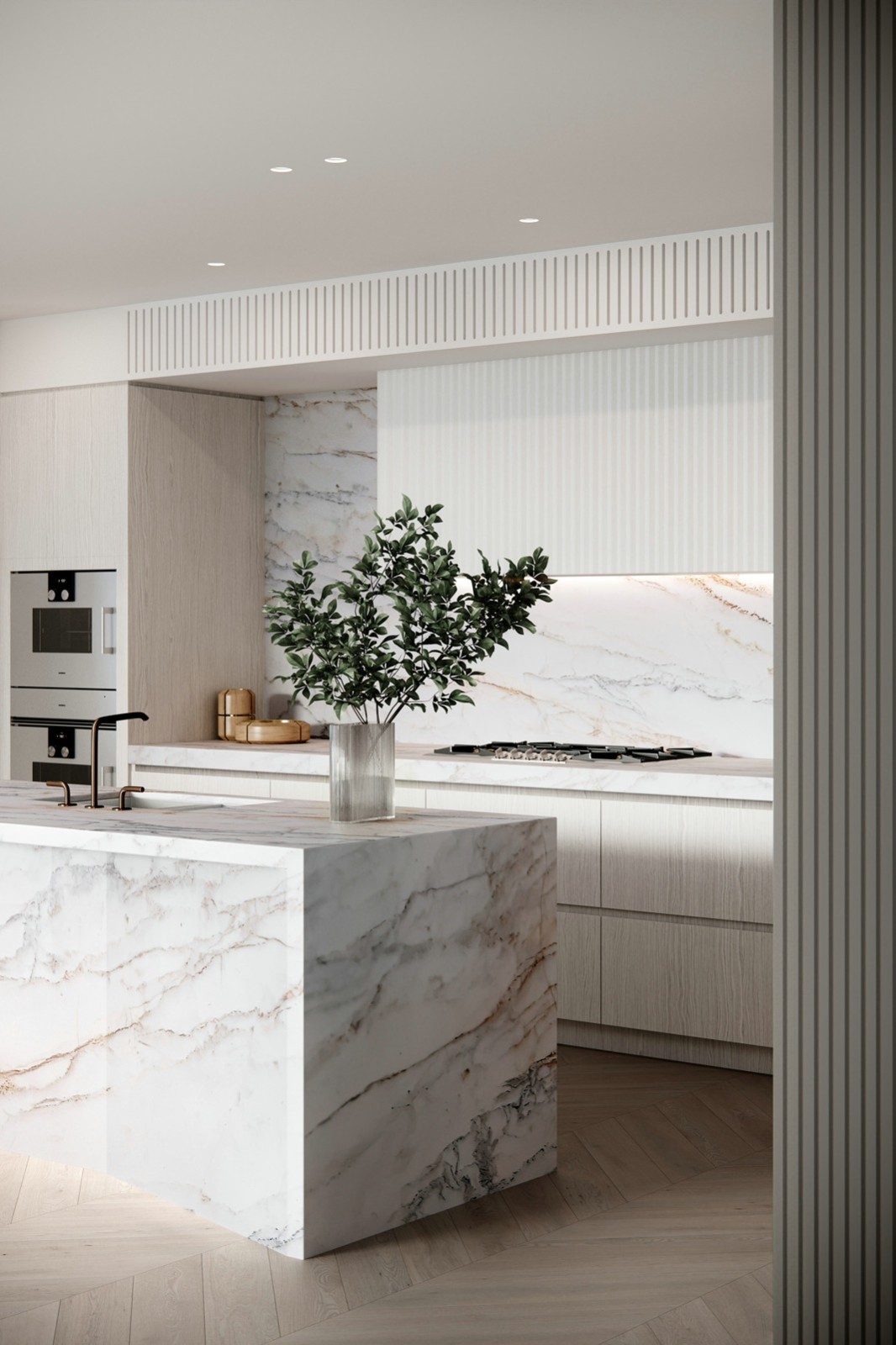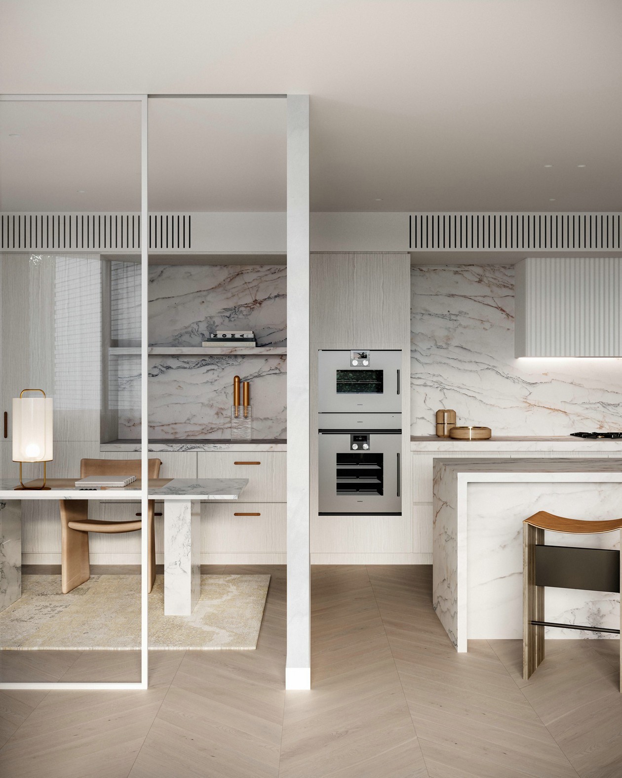 人字紋鋪設(shè)的橡木地板和寬敞的平板大理石柜臺(tái)和架子等細(xì)紋細(xì)節(jié)營(yíng)造出優(yōu)雅而實(shí)用的主題。