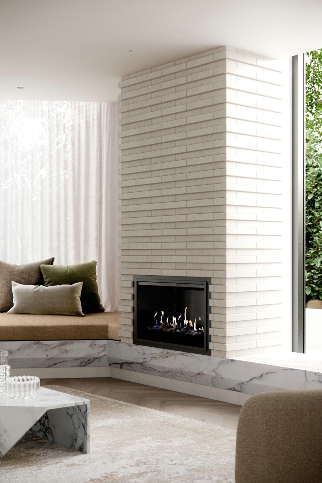 在涼爽的月份里,閃爍的火光增添了溫暖,而內(nèi)置的軟墊長(zhǎng)椅則為放松身心提供了親密的財(cái)富。