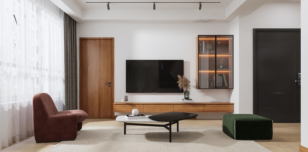 有別于一般電視墻大做巧飾,墻面不做過多裝飾,盡量保持干凈簡潔的面貌,以收納、展示等功能性為主,大面積留空,讓視覺焦點集中在電視影像上。