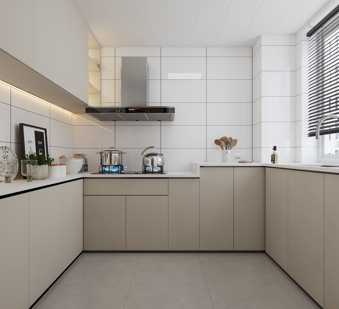 廚房設(shè)計以簡約大方為主,大面積的淺色瓷磚使用使空間看起來更開闊,搭配上淺灰咖色的櫥柜面板,品質(zhì)感滿分。