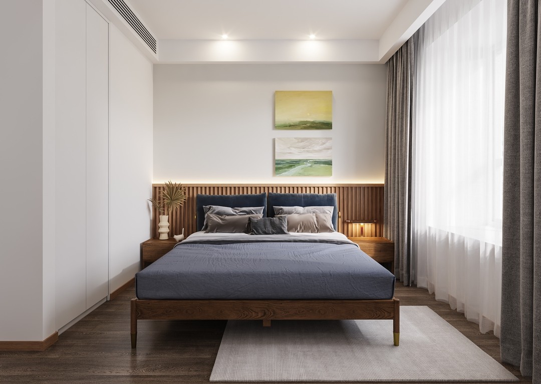 沒有過多的裝飾,視覺中足夠的留白,卻不顯冰冷,顯與隱,互相作用?;疑财罚唵尾皇肺?,木飾床頭散發(fā)出寧靜氣息,光線透過紗簾在臥室自由流轉(zhuǎn),一切都剛剛好。