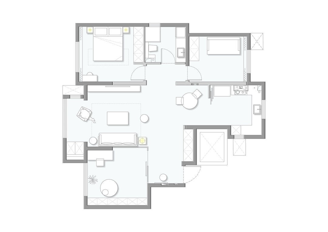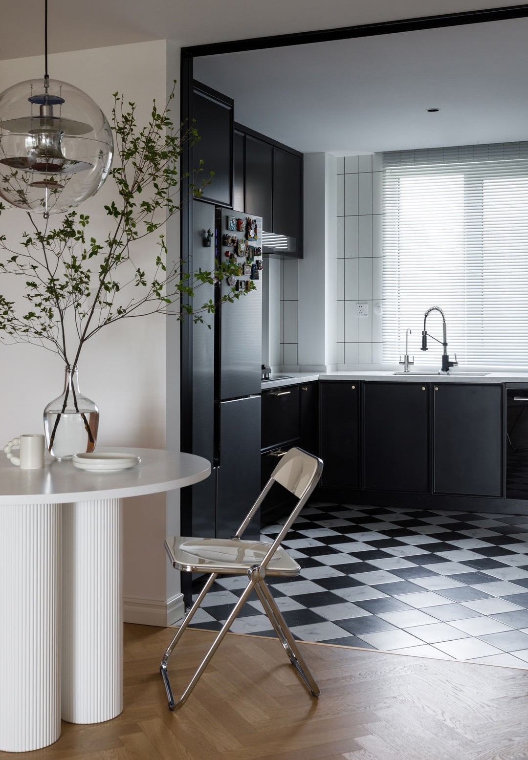 在白色的基礎(chǔ)上,大面積的色塊在客廳中鋪展開來。書房的布置透過玻璃隔斷,與黑色的沙發(fā)背景墻重疊相映。墻面石膏線與吊頂邊沿的裝飾線,搭配經(jīng)典昌迪加爾椅,增添了許多精致的復(fù)古心思。