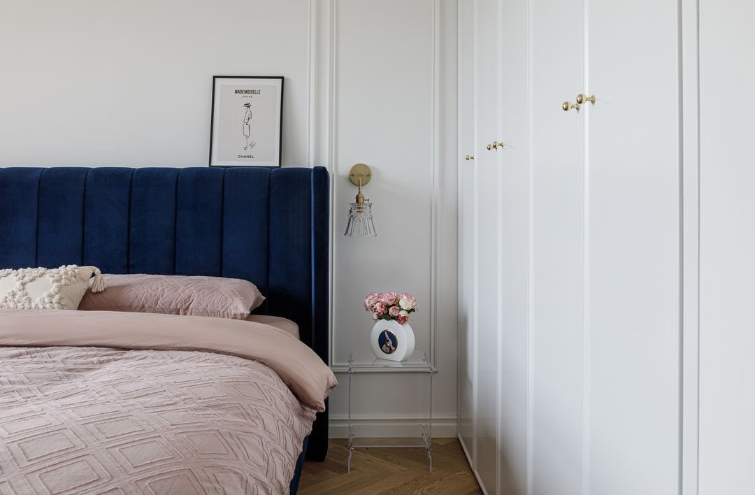 白色的臥室干凈簡潔,是整個家居空間中最放松的留白。內(nèi)嵌式衣柜和透明的床頭柜輕盈精致,視覺上將睡眠空間一再簡化。床頭背景墻簡單的幾筆石膏線造型,和深藍色床頭巧妙融合在一起,帶來寧靜精致的舒適感。