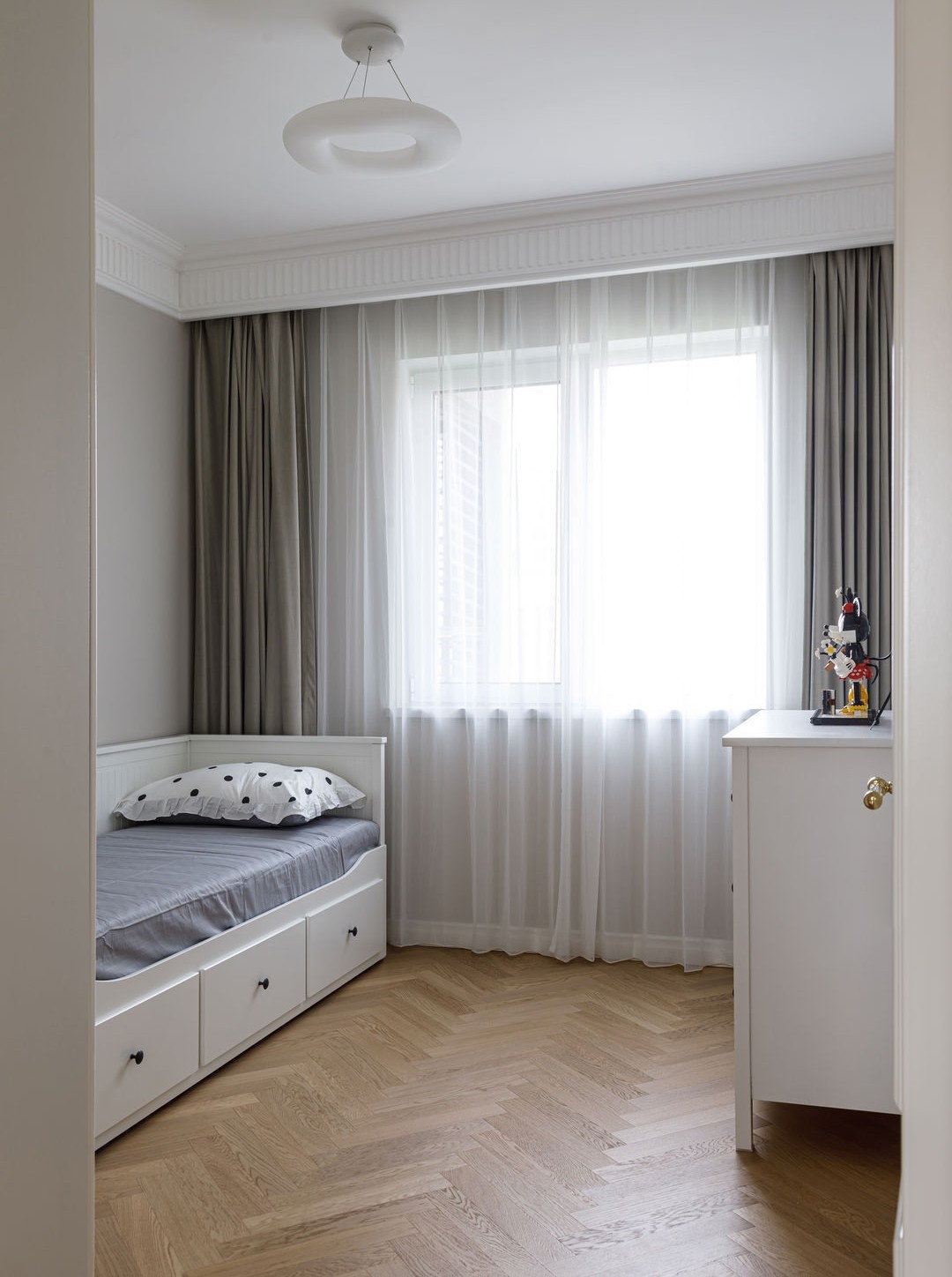 兒童房現(xiàn)在還沒有它的小主人,所以只配備了基礎(chǔ)家具——一張兒童床加上小衣柜。白色的小家具實用百搭,兼?zhèn)涫占{功能。小房間里的余留空地,都等待小寶寶到來后自己慢慢填滿。