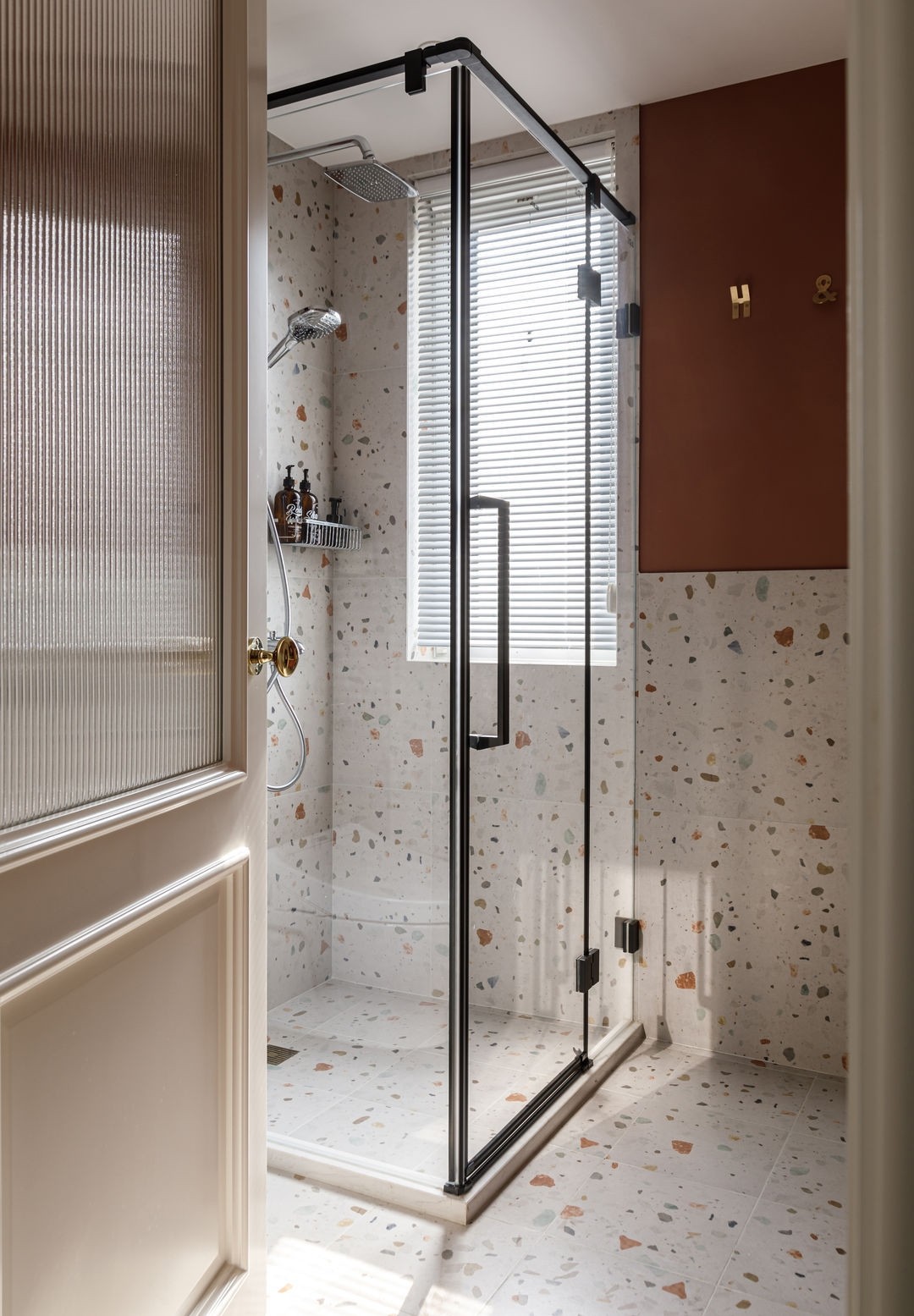 衛(wèi)生間是經(jīng)典的干濕分離格局,僅5㎡的空間利用率非常高,完美收納了洗漱臺、儲物柜、洗衣機、烘干機。透過長虹玻璃門,光線還能引入到走廊內(nèi)。墻磚是細碎的水磨石紋理,與橘紅色墻面搭配出浪漫安靜的氛圍感。