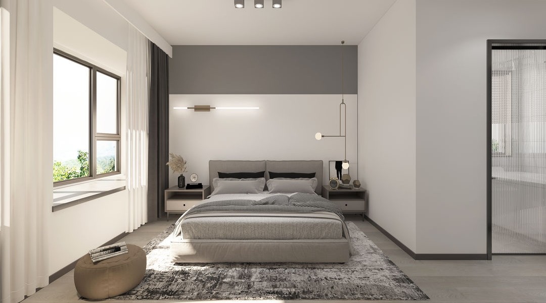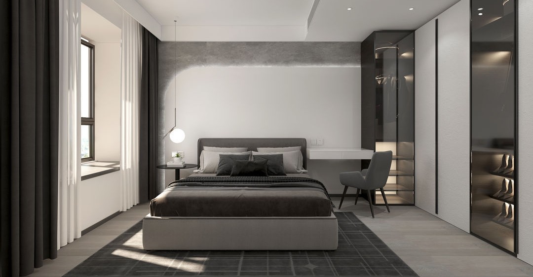 次臥承襲了整個空間黑白灰的基調(diào),床頭背景墻用愛格板來做裝飾內(nèi)嵌燈帶,營造臥室的空間氛圍。床側(cè)設(shè)計了整排的衣柜,增強了儲物功能。